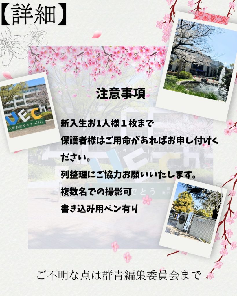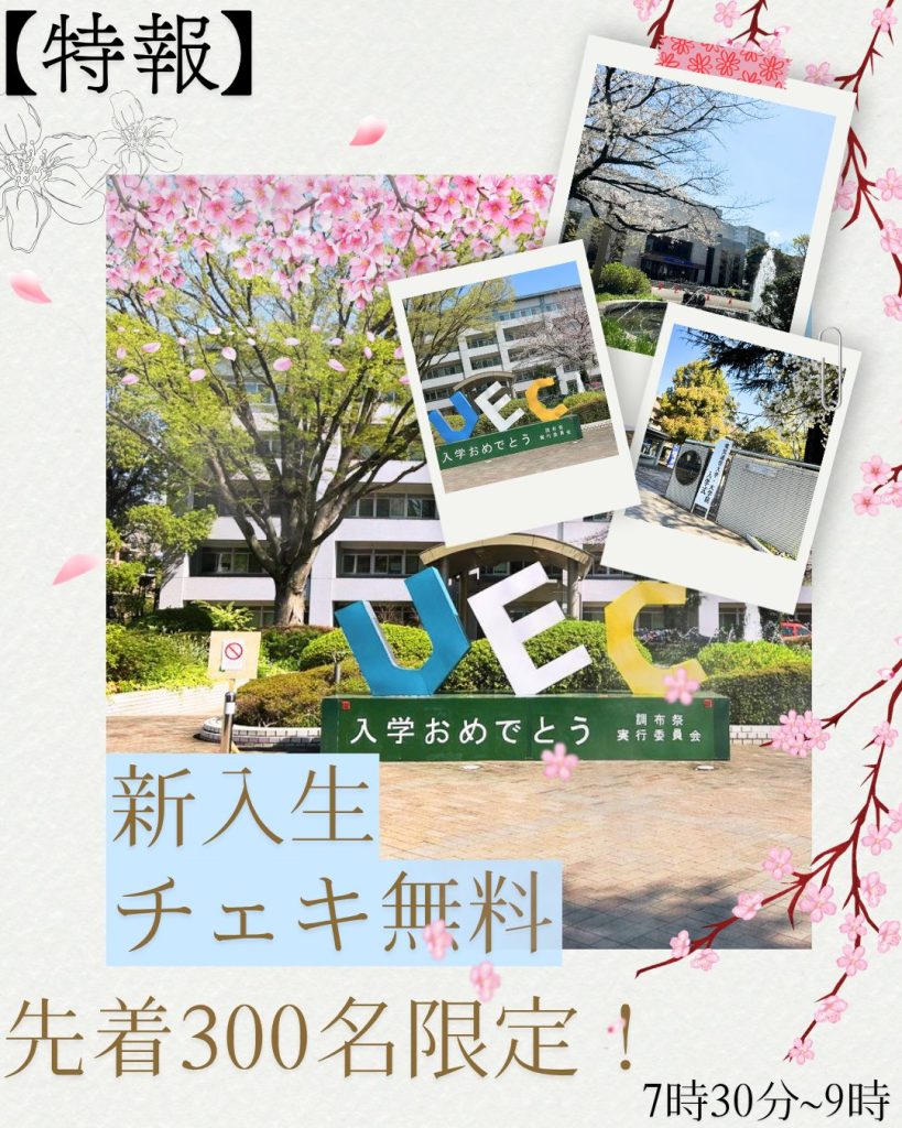 新入生の皆さん、ご入学おめでとうございます! 電気通信大学学友会です。