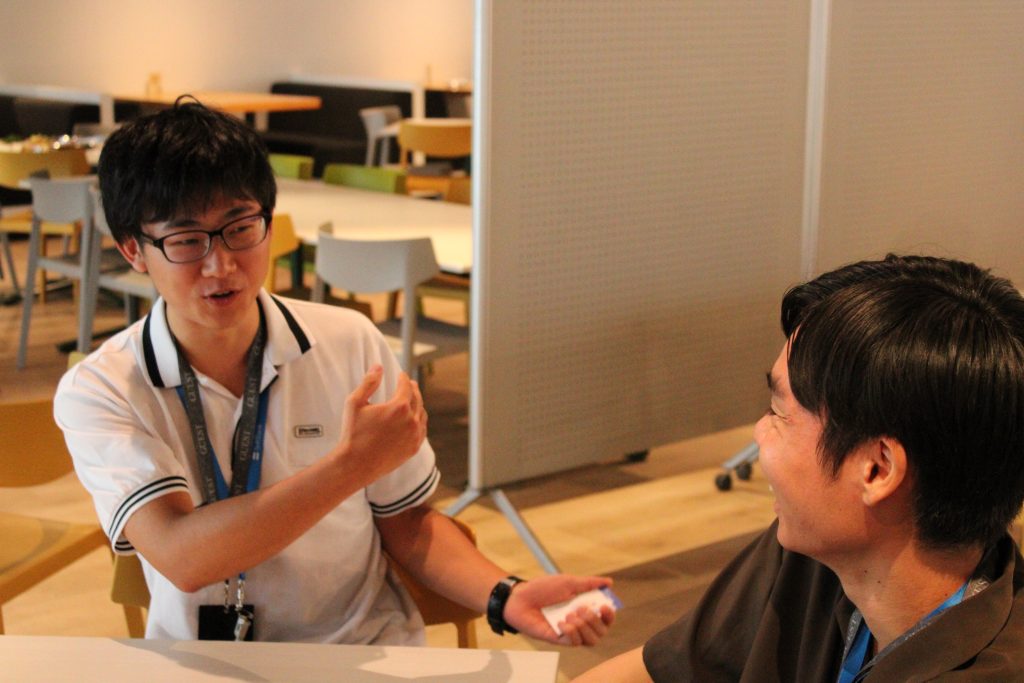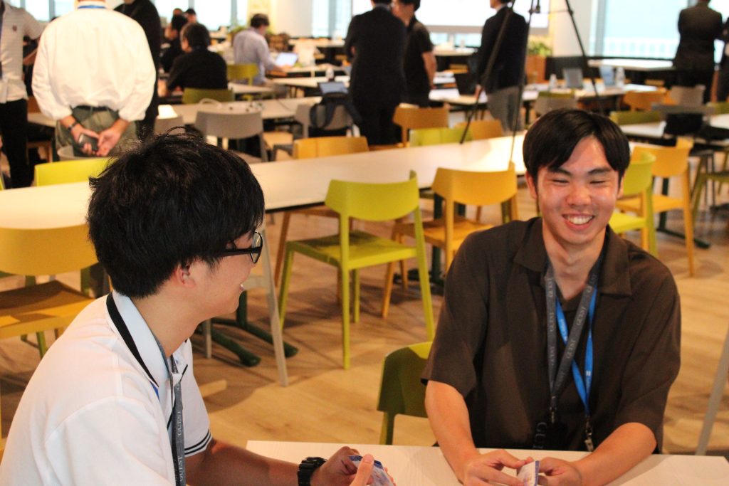 ハッカソンで同じグループになったメンバーからのお土産話に花を咲かせる佐藤さん(右)と織田さん(左)