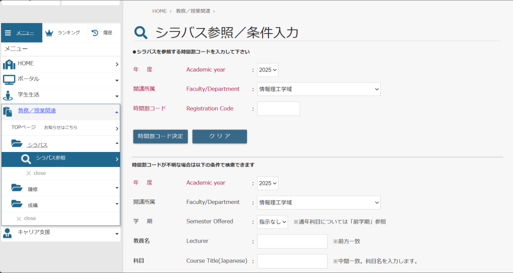 シラバスを検索する画面に出るので自分が見たい授業の特徴を入力して一番下の検索開始を押します。(指定がない場合は空欄でも大丈夫です。)