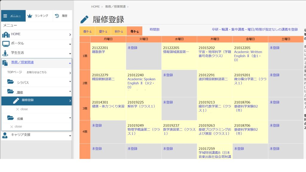 すると、自分の在籍情報の下側に時間割表が出てきます。(上の画像は登録済みの画像です、新1年生の皆さんの画面は未登録という文字が並んでいると思います。)履修登録をする際には、履修登録したい曜日の時限の未登録という文字を押します。