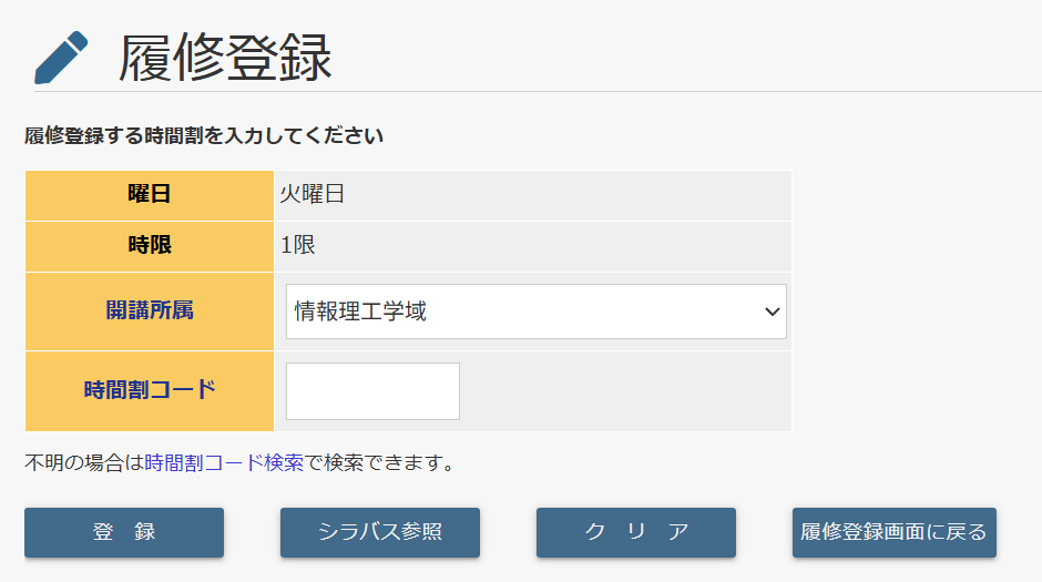 未登録を押すとこのような画面になります。この時間割コードという欄に自分が履修登録したい科目の先程確認した、シラバスのページに書いてあった8桁の数字を入力して、登録ボタンを押します。これを時間割の通りに全ての科目で行います。これで履修登録は完了です。